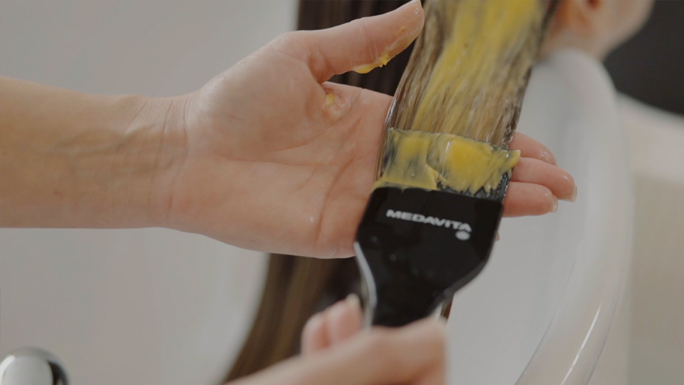 Transfer 20-30 ml of ß-REFIBRE Reconstructive hair fluid (adapting the quantity to the hair type) into the medavita bowl and separate the hair into cross-shaped sections. Distribute evenly on dry hair lengths with the brush, following transversal hair sections. Massage the hair locks to evenly distribute the product. Leave to act from 15 to 30 minutes (according to the level of hair damage) without heat source. Gently pour some water by using the bowl and emulsify the product. Rinse thoroughly with plenty of water.